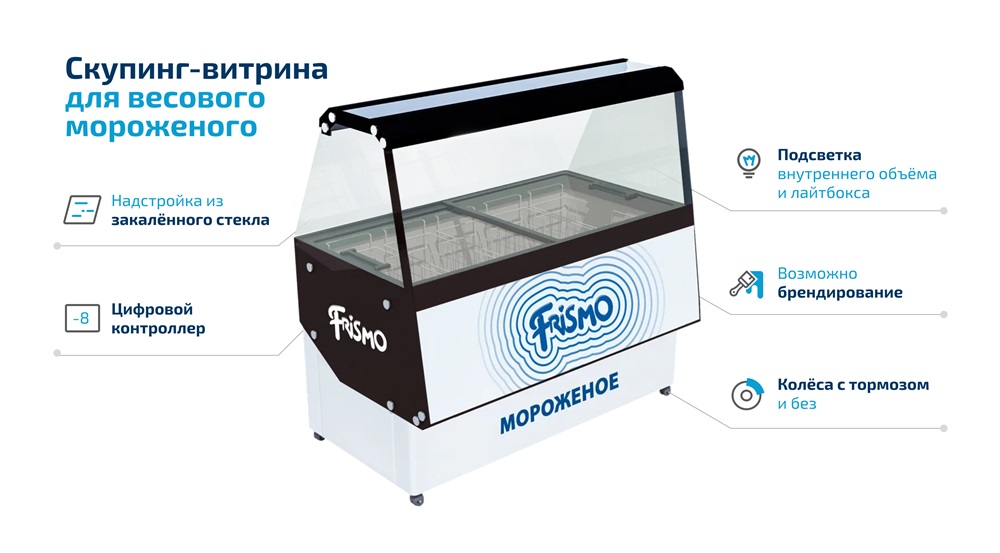 Витрина Frostor FRISMO SCOOPING-9 предназначается для охлаждения, хранения и демонстрационной выкладки мороженого на предприятиях общественного питания и торговли. Модель оснащена цифровым контроллером, принудительной оттайкой, надстройкой, подсветкой внутреннего объема и лайтбокса и колесами с тормозами. Материал корпуса - оцинкованная сталь, материал надстройки - закаленное стекло.