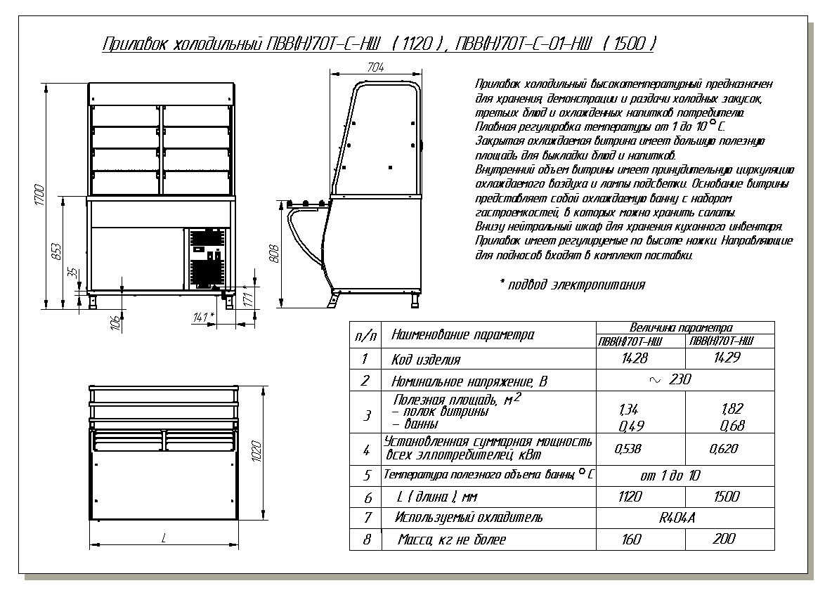 Прилавок-витрина Abat ПВВ(Н)-70Т-С-01-НШпредназначен для демонстрации, охлаждения, кратковременного хранения блюд, холодных закусок и напитков в составе линий раздач на предприятиях общественного питания и торговли. Модель оснащена регулируемыми по высоте ножками.