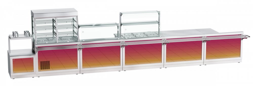 Мармит Abat ЭМК-70Х-01 предназначен для демонстрации, кратковременного хранения и поддержания в горячем состоянии первых и вторых блюд в составе линий раздач на предприятиях общественного питания и торговли. Модель оснащена 1 терморегулятором, 3 ПЭНами, 1 стеклянной полкой и LED-лампой освещения. Облицовки, ванна и столешница выполнены из нержавеющей стали.