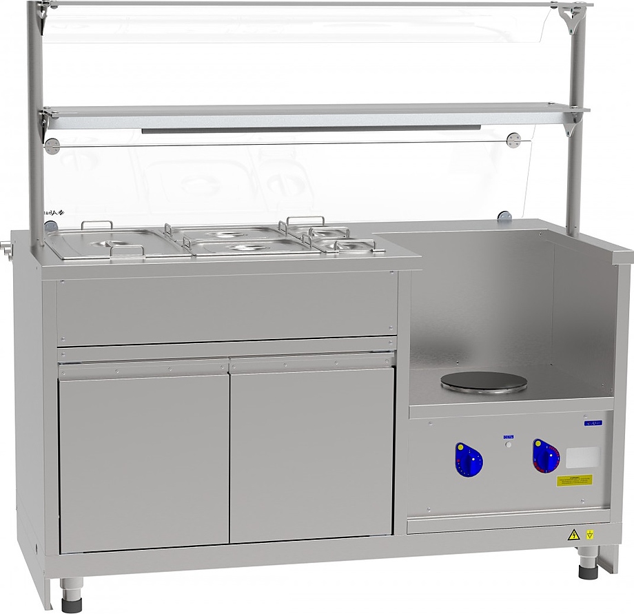 В комплекте 2 полки для выкладки порционных блюд, направляющие для подносов, гастроемкости глубиной 150 мм: GN 1/1, 2хGN 1/2, 2хGN1/4.