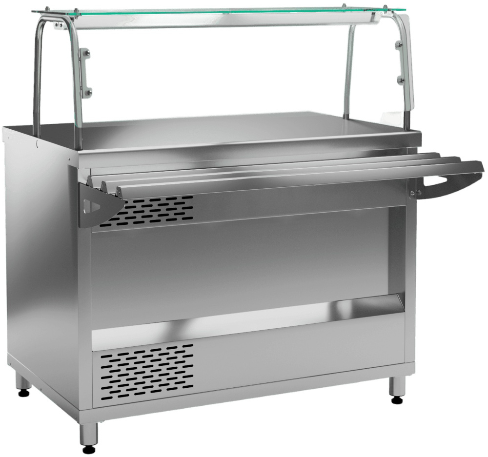 Прилавок-витрина Марихолодмаш ПВХЭ11В используется в составе линии раздачи Шеф 1120 на предприятиях общественного питания, торговли и пищевых производствах для демонстрационной выкладки и кратковременного хранения первых блюд, хлебобулочных и кондитерских изделий, напитков и посуды. Прилавок оснащен охлаждаемой столешницей, полкой и диодным освещением. Материал корпуса - высококачественная нержавеющая сталь.