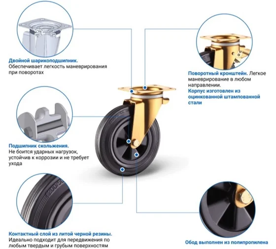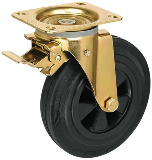 Колесо поворотное Дигрус ф160 ПКОТу-Д 160 (D160) используется для установки на грузовые тележки на предприятиях общественного питания, торговли и пищевых производствах. Модель с задним тормозом. Материал колес - резина, материал борта - прочный пластик, материал кронштейна - оцинкованная сталь.