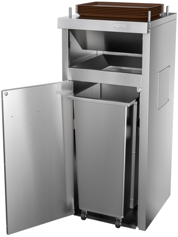 ATESY ССО-120-С-01 используется на предприятиях общественного питания, торговли для утилизации пищевых остатков, одноразовой посуды и различной картонной упаковки. В модели предусмотрена полка для подносов и внутренний мусороприемник на колесах. Тумба и емкость - шлифованная легированная стал.