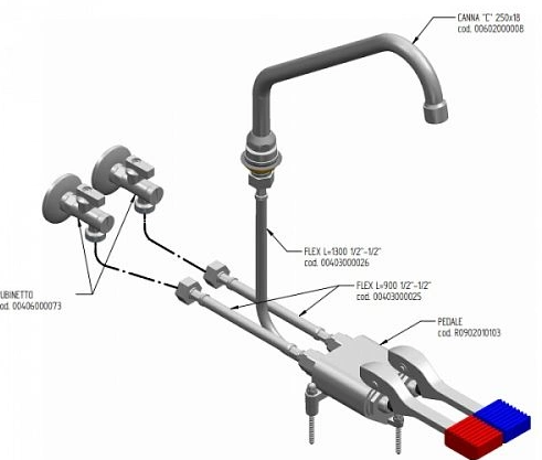 Смеситель педальный Monolith R0902020203 используется на предприятиях общественного питания, торговли и пищевых производствах для ежедневной подачи воды. Модель оснащена двумя педалями для горячей и холодной воды.