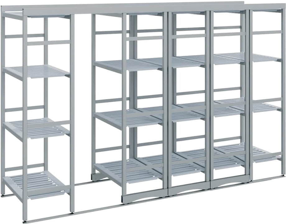 Модульный передвижной стеллаж POLAIR LOAD.ME COMPACT SC 5PP.50.06.5 используется на предприятиях общественного питания, торговли, производствах, складских помещениях, прачечных и прочих предприятиях для хранения продукции. Решетчатые полки регулируется по высоте. Стеллаж оснащен колесиками внизу модуля и роликами сверху. Модель может использоваться как самостоятельно, так и соединяться в линии с другими передвижными стеллажами с помощью специальной рельсовой системы. Передвижные модули размещаются между стационарными стеллажами. Материал каркаса - анодированный алюминиевый профиль, материал полок - армированный полипропилен.