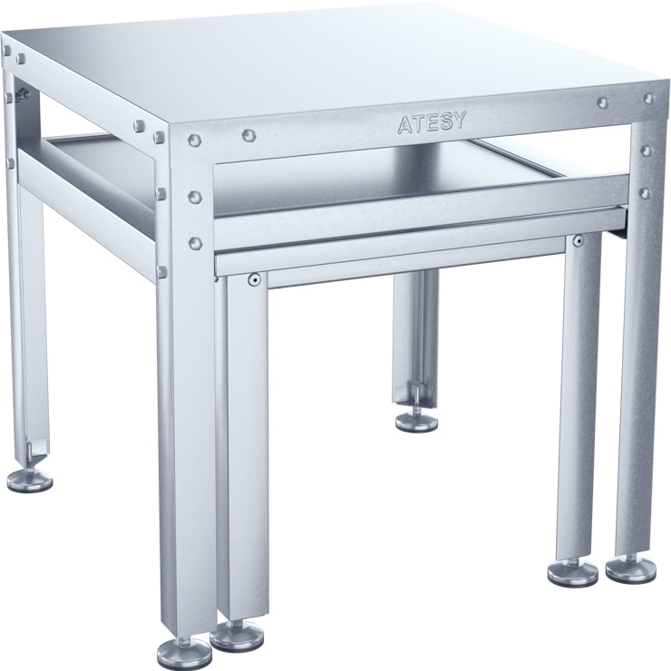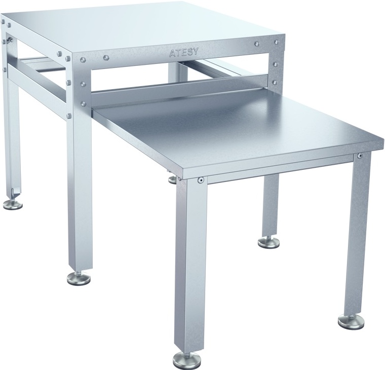 Подставка ATESY ПДЭ-С-500.500.500-02 используется на предприятиях общественного питания и торговли для установки электромеханического оборудования, такого как мясорубки и овощерезки. Столешница, полка и ножки в виде уголка выполнены из нержавеющей стали AISI 430 толщиной 0,8 мм.