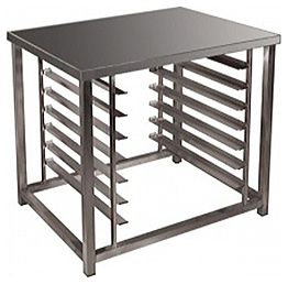Подставка Rada ПКП-9/7-01Н используется совместно с пароконвектоматами. Модель оборудована 7 парами направляющих для гастроемкостей GN 1/1 или кондитерских листов (655х610). Модель изготовлена из нержавеющей стали AISI 304.