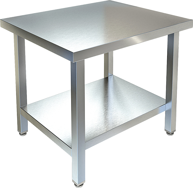Подставка ТТМ ППО-095/7,8-Н85 Сварная модель оснащена усиленной ДСП столешницей, усиленной швеллером сплошной полкой и регулируемыми по высоте ножками. Каркас выполнен из нержавеющей профильной трубы.