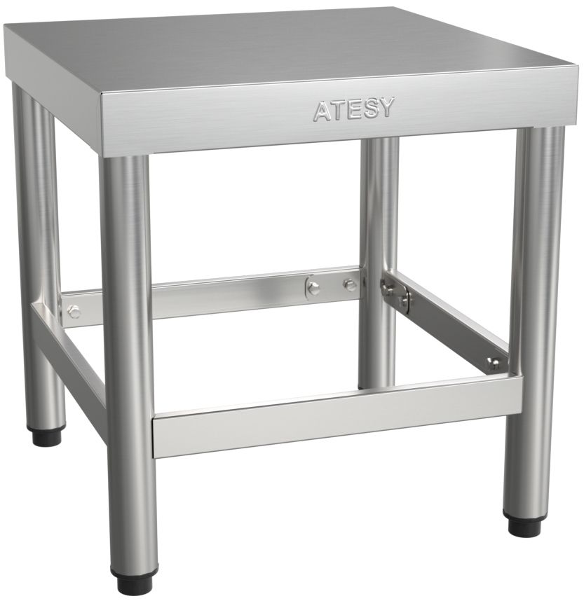 Подставка ATESY ПКИ-П-600.400.420-02 серии Престиж используется на предприятиях общественного питания и торговли для установки различного кухонного оборудования и инвентаря. Столешница и обвязка выполнены из нержавеющей стали AISI 430 толщиной 0,8 мм, ножки - из круглой трубы 40х40 мм из нержавеющей стали AISI 201.