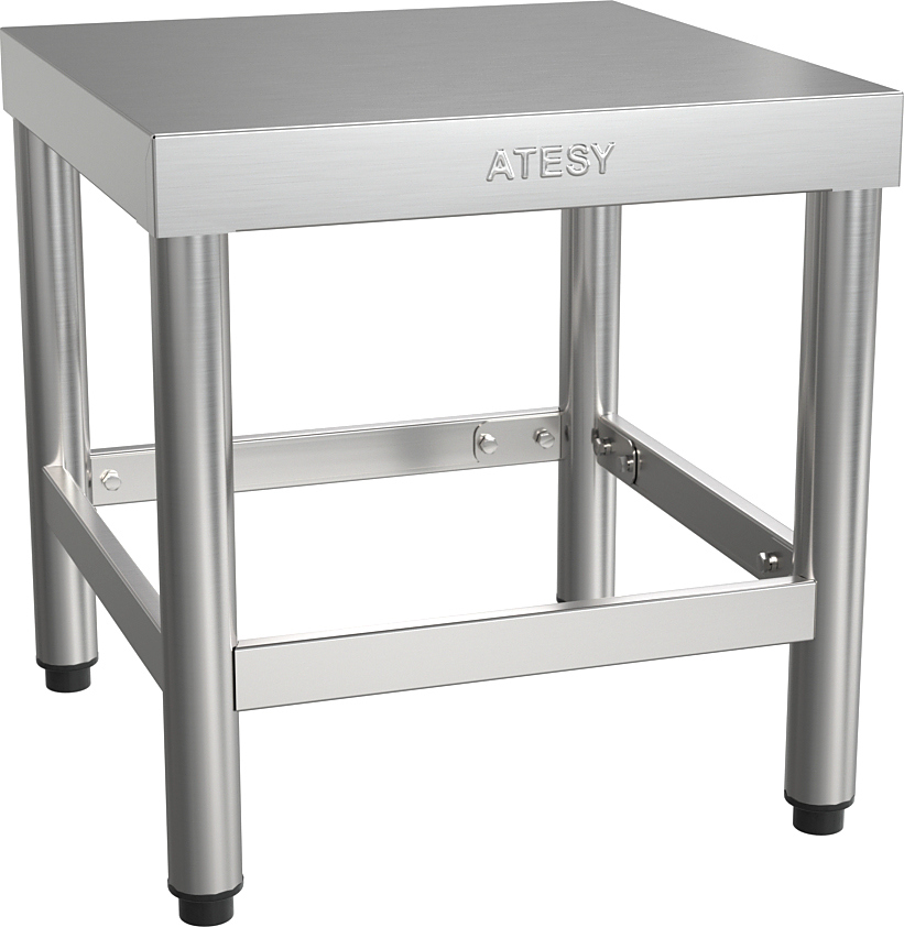 Подставка ATESY ПКИ-П-1100.600.420-02 серии Престиж используется на предприятиях общественного питания и торговли для установки различного кухонного оборудования и инвентаря. Столешница и обвязка выполнены из нержавеющей стали AISI 430 толщиной 0,8 мм, ножки - из круглой трубы 40х40 мм из нержавеющей стали AISI 201.