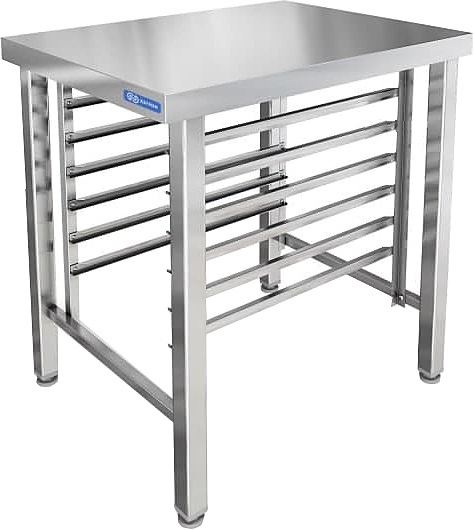 Подставка KAYMAN ПКУ-2 используется на предприятиях общественного питания и торговли совместно с пароконвектоматами серии COMPACT для хранения противней и гастроемкостей GN 1/1. Каркас выполнен из нержавеющей трубы AISI 430, столешница - из нержавеющей стали AISI 430.