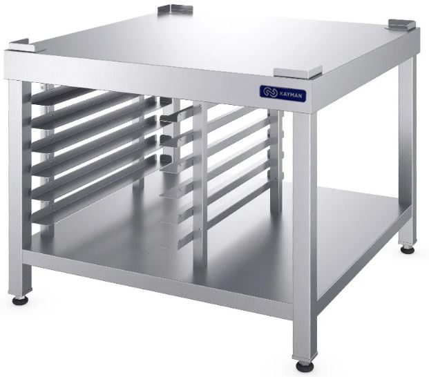 Подставка под пароконвектомат KAYMAN ПКУ-530/0808 А используется на предприятиях общественного питания, торговли и пищевых производствах для установки электрического пароконвектомата ПКЭ-10-И А. Модель оснащена полкой, столешницей и регулируемыми ножками. Материал столешницы, направляющих и полки - высококачественная нержавеющая сталь AISI 304, материал стоек - высококачественная нержавеющая сталь AISI 201 (труба 40х40 мм).