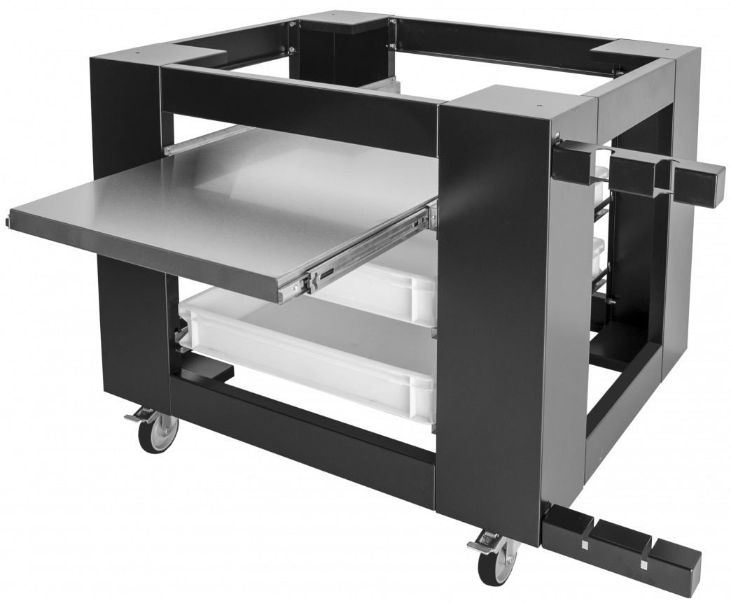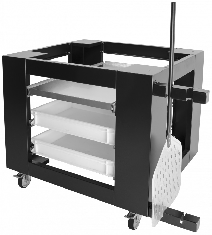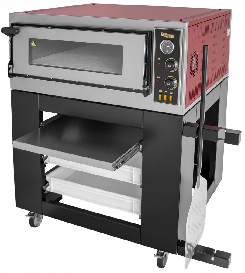 Подставка Grill Master используется на предприятиях общественного питания, торговли и пищевых производствах для установки печей для пиццы ППЭ/1-4-35. Модель оснащена выдвижной полкой, направляющими для 4 контейнеров для теста или противней 600х400 мм, держателями для лопат и колесами со стопорами. Материал изделия - высококачественная нержавеющая сталь, покрытая черной полимерной краской.