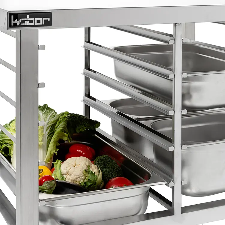 Подставка изготовлена из высококачественной стали. Изделие имеет направляющие, позволяющие разместить в них гастроемкости либо противни, в зависимости от модели подставки. Каркас произведен из нержавеющей квадратной трубы 40х40 мм. Ножки регулируются по высоте, что позволяет исправить неровности пола.