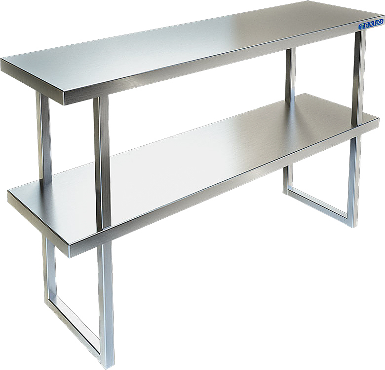 Кухонная двухъярусная полка Техно-ТТ ПН-820/1300 предназначена для хранения посуды, различного инвентаря и сухих продуктов на предприятиях общественного питания, торговли и пищевых производствах. Изделие крепится к столешнице при помощи болтов через отверстия в боковинах. Материал разборного каркаса - нержавеющая сталь AISI 430, боковины из трубы 20x20 мм.