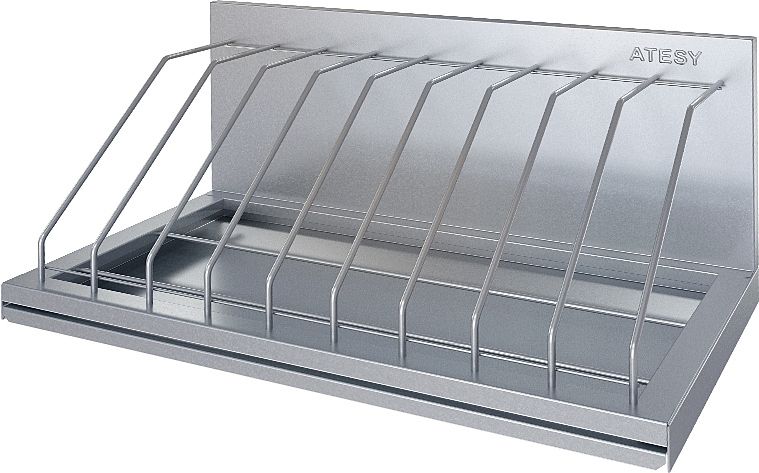Кухонная полка ATESY ПКД-С-600.350-9-02-В серии Стандарт используется для сушки и хранения разделочных досок на предприятиях общественного питания и торговли. Полка выполнена из нержавеющей стали AISI 430, отделения - из нержавеющего прутка AISI 304.