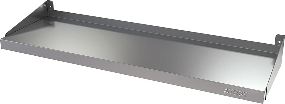 Кухонная полка ATESY ПНК-С-950.300-02 серии Стандарт используется на предприятиях общественного питания, торговли и пищевых производствах для хранения посуды, продуктов и кухонного инвентаря. Края имеют подгибы, полка оснащена бортиком с пристенной стороны. Материал полки - нержавеющая сталь AISI 430 (толщина 0.8 мм).