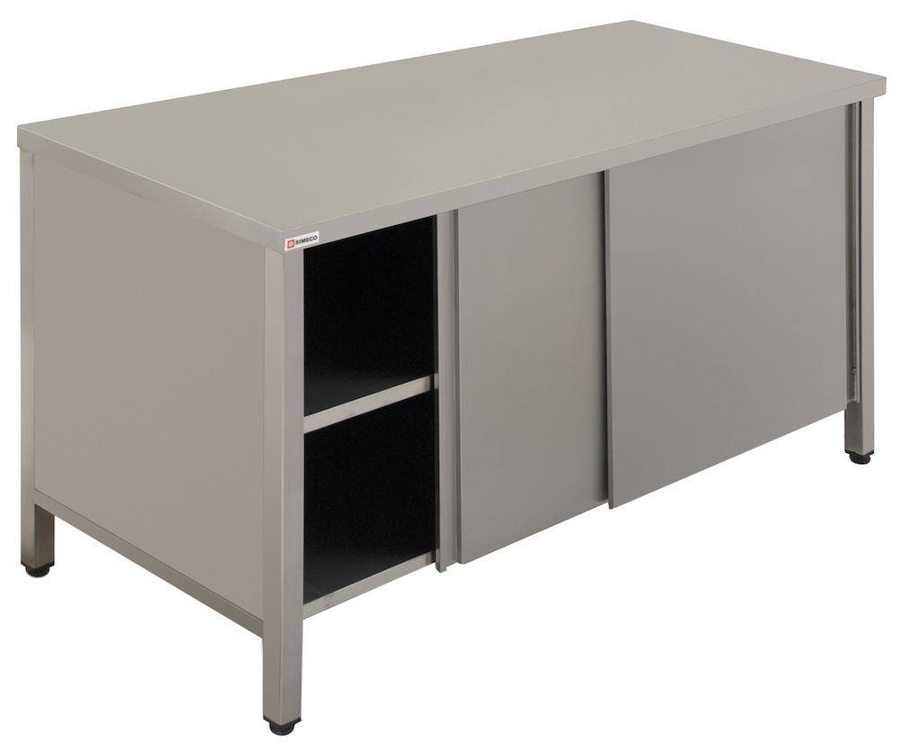 Simeco СЗE1007К используется на предприятиях общественного питания и торговли для приготовления различных блюд, а так же для хранения посуды и сыпучих продуктов. Модель закрыта с трех сторон. Имеет двери-купе и сплошную полку из нержавеющей стали. Каркас стола выполнен из нержавеющей стали AISI 430, столешница - из нержавеющей стали AISI 430. Ножки - труба 40х40 мм.