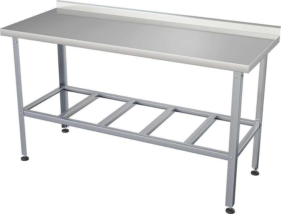 Производственный стол ATESY СР-С-1-1000.600-02-Н серии Стандарт предназначается для разделывания и обработки пищевых продуктов, использования кухонного оборудования на предприятиях общественного питания, торговли и пищевых производствах. Конструкция - разборная. Кромки столешницы и каркаса имеют безопасную фальцовку, углы столешницы заварены и зашлифованы. Опоры ножек регулируются по высоте. Материал каркаса, столешницы и полки - нержавеющая сталь AISI 430 (толщина 0.8 мм).