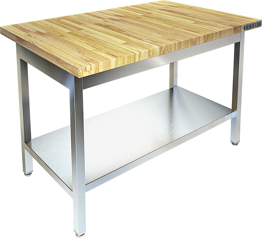 Кондитерский стол Техно-ТТ СП-323/1308 предназначен для раскатки теста и обработки ингредиентов для приготовления кондитерских и хлебобулочных изделий, а также для расстановки и хранения посуды и кухонного инвентаря на предприятиях общественного питания, торговли и пищевых производствах. Модель оснащена регулируемыми по высоте ножками, что позволяет компенсировать неровности пола. Материал разборного каркаса - труба (40x40 мм) из нержавеющей стали AISI 304, материал сплошной полки - нержавеющая сталь AISI 430, материал столешницы - бук.
