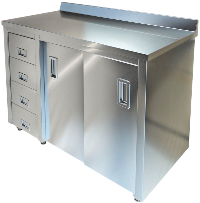 Производственный стол-тумба Техно-ТТ СПС-226/1808-Л предназначен для разделки и обработки пищевых продуктов, а также для расстановки и хранения посуды и кухонного инвентаря на предприятиях общественного питания, торговли и пищевых производствах. Стол оснащен бортом, 2 дверьми-купе и 4 выдвижными ящиками. Материал корпуса - нержавеющая сталь AISI 430, материал столешницы - нержавеющая сталь AISI 304, материал задней стенки - оцинкованная сталь.