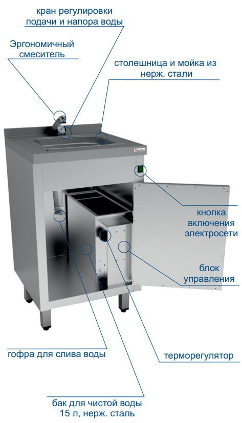 В комплект поставки входят: сифон, смеситель, помпа, бак для чистой воды на 15 л и бак для слива на 10 л.