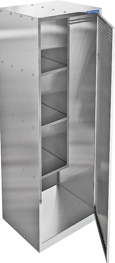 Шкаф KAYMAN ШР-23/0605 предназначается для хранения уборочного инвентаря на предприятиях общественного питания, торговли, пищевых и промышленных производствах. Модель оснащена полками регулируемыми по высоте, крючками и распашной дверью с замком. Материал шкафа - крашенная сталь.