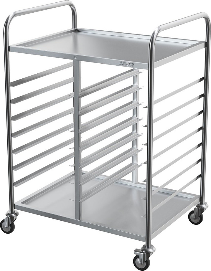 Тележка ATESY ТГ-С-2.14-1.1-02 серии Стандарт предназначается для временного хранения и перемещения гастроемкостей между линиями раздачи готовых блюд и кухней на предприятиях общественного питания, торговли и пищевых производствах. Тележка оснащена верхней полкой, 4 поворотными колесами (2 с тормозами), кромки направляющих имеют фальцованы. Тип конструкции - разборная. Материал рамы - нержавеющая труба AISI 201.