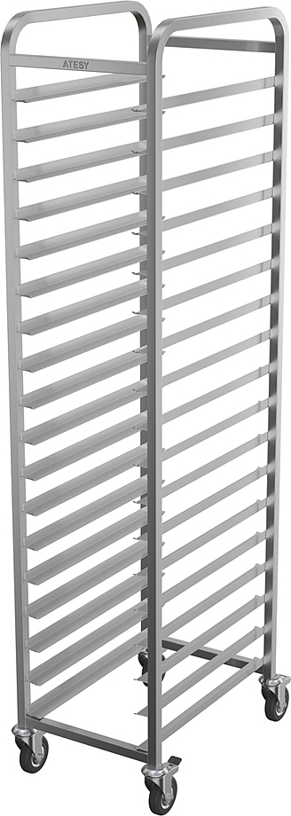 Тележка-шпилька ATESY КШ-С-1.18-350.600-02 серии Стандарт предназначается для временного хранения и перемещения гастроемкостей между линиями раздачи готовых блюд и кухней на предприятиях общественного питания, торговли и пищевых производствах. Тележка оснащена 4 поворотными колесами (2 с тормозами), кромками с безопасным подгибом. Тип конструкции - сварная, стойки из труб квадратного сечения. Материал конструкции - нержавеющая сталь AISI 304.