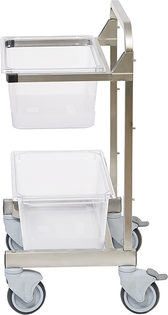 Тележка Robot Coupe 49128 используется на предприятиях общественного питания, торговли и пищевых производствах для транспортировки различных овощей и фруктов в гастроёмкостях GN 1/1. Используется совместно с овощерезками CL55. Тележка оснащена 2 гастроемкостями GN 1/1, 4 поворотными колесами (2 с тормозами). Тип конструкции - открытая, материал каркаса - высококачественная нержавеющая сталь.
