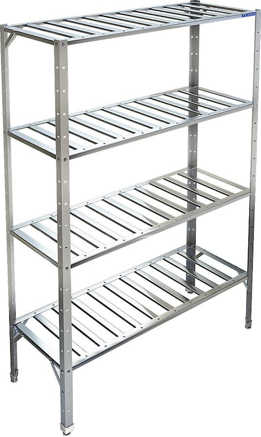 Кухонный стеллаж Техно-ТТ СТР-014/504 используется на предприятиях общественного питания, торговли и пищевых производствах для хранения посуды, кухонного инвентаря и продуктов. В модели предусмотрены регулируемые ножки и полки. Тип каркаса - разборный, полки - решетки. Материал каркаса - крашеный металл (уголок 40х40 мм толщиной 2 мм), материал решетчатых полок - нержавеющая сталь AISI 430 (толщина 0.8 мм).