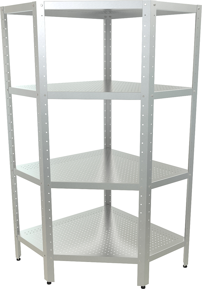 Угловой кухонный стеллаж Кобор СКПУ-5/6-100/90 предназначен для хранения посуды, различного инвентаря и сухих продуктов на предприятиях общественного питания, торговли и пищевых производствах. Тип каркаса - разборный, полки - сплошные. Материал каркаса - оцинкованная сталь, материал перфорированных полок - нержавеющая сталь AISI 430.