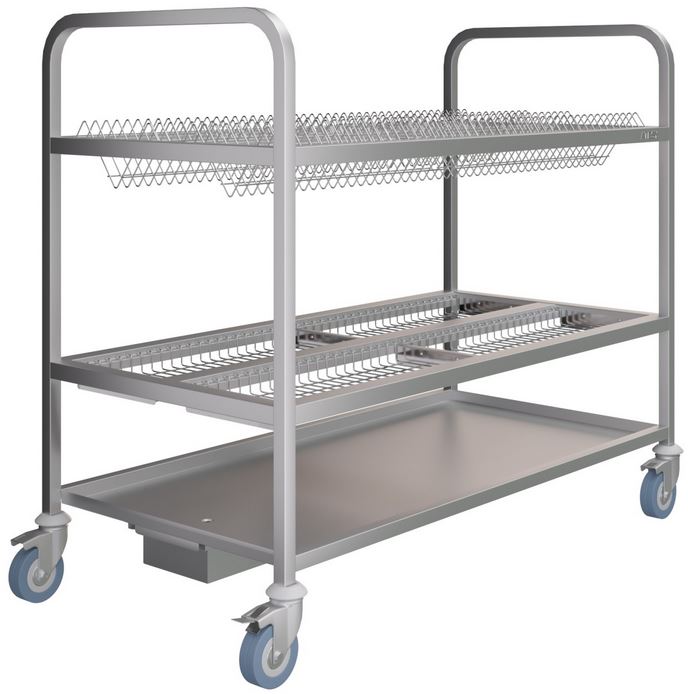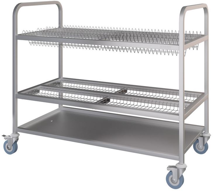Тележка ATESY ТТС-Л-2-1200.600-02 серии Люкс используется на предприятиях общественного питания, торговли и пищевых производствах для временного хранения, транспортировки и естественной сушки тарелок и стаканов. Модель оснащена съемными кассетами для сушки тарелок и колесами. Материал кассет, пруток, поддона и стоек - высококачественная нержавеющая сталь AISI 304.
