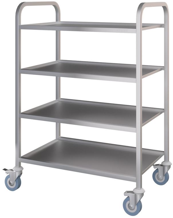 Тележка ATESY ТС-Л-4-800.500.1100-02 серии Люкс используется на предприятиях общественного питания, торговли и пищевых производствах для перемещения в зал готовых блюд, напитков и посуды, а также для сбора грязной посуды. Модель оснащена бортиком по периметру и колесами. Материал полок и стоек - высококачественная нержавеющая сталь AISI 304.