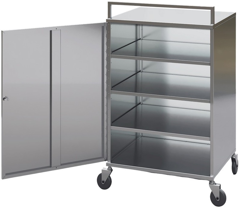 Тележка Марихолодмаш 695175.00 используется для перевозки готовых блюд, мясных полуфабрикатов, а также других продуктов и инвентаря на предприятиях общественного питания, торговли и пищевых производствах. Модель оснащена колесам, 2 из которых с тормозом и и глухой дверью. Материал каркаса, обшивки, полок и двери - высококачественная нержавеющая сталь AISI 430.