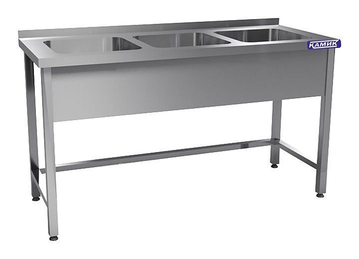 Моечная ванна КАМИК ВМ-3-40177 используется на предприятиях общественного питания и торговли для мойки посуды, овощей и фруктов. Сварной каркас и столешница выполнены из нержавеющей стали AISI 430, цельнотянутая емкость - из нержавеющей стали AISI 304.