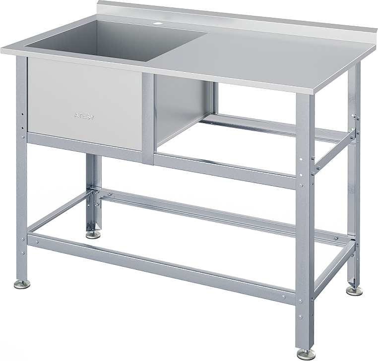 Моечная ванна ATESY ВСМС-Б-1Л.600-1350.750-1-02 серии Бюджет предназначается для мытья посуды и кухонного инвентаря, овощей и фруктов, а также для оттайки замороженных продуктов. Кромки ванны имеют безопасную фальцовку, углы зашлифованы. Ножки регулируются по высоте. Тип конструкции - разборная. Поверхность стола с внутренней стороны укреплена ламинированной ДСП, что увеличивает прочность и исключает прогиб. Материал каркаса - профиль из оцинкованной стали (толщина 1.2 мм), материал ванны - нержавеющая сталь AISI 430 (толщина 0.7 мм), материал опоры регуляторов высоты - нержавеющая сталь, ножки выполнены из пластика.