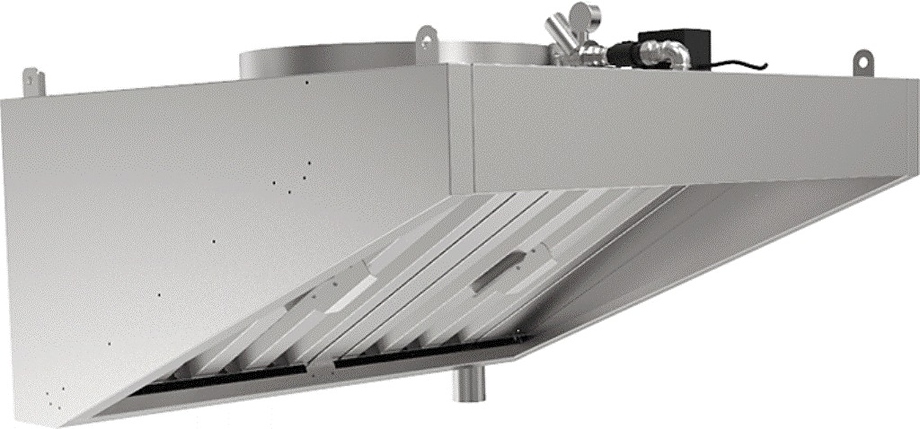 Вытяжной зонт с гидрозатвором Кобор HFR-2-200/120/К используется на предприятиях общественного питания и пищевых производствах с использованием открытого огня. Воздушные массы проходят фильтрацию от жира и сажи и попадают в водяную завесу, охлаждающую и удаляющую остатки продуктов горения. Очищенный воздух поступает в вентиляционную систему, использованная жидкость и примеси удаляются в канализационный сток. Зонт оснащен системой подачи и распыления жидкости. Материал каркаса - нержавеющая сталь AISI 430.
