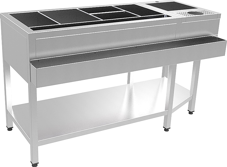 Барная станция Кобор СБ-150/68 предназначена для оборудования барных стоек, их продуктивного функционирования и оптимизации работы сотрудников на предприятиях общественного питания и торговли. Модель оснащена полкой и регулируемыми по высоте опорами ножек. Каркас выполнен из нержавеющей стальной квадратной трубы 40х40 мм, сварные раковины - из нержавеющей стали AISI 430.