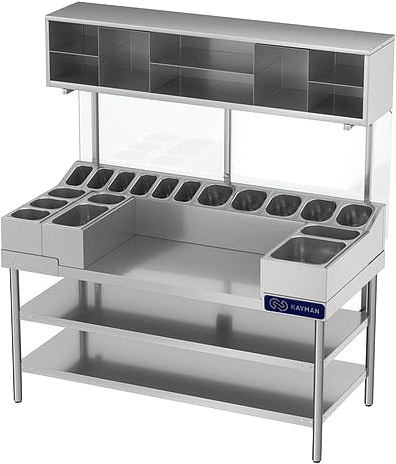 Блинная станция KAYMAN СП-Б-1500 А используется на предприятиях общественного питания и торговли для комплексного оснащения места для приготовления и раздачи блинов с начинкой. Модель дает возможность для установки блинницы БЭ-2-360 А и газовой блинницы БГ-2-360 А благодаря съемным холдерам. Материал изделия - высококачественная нержавеющая сталь (труба 40х40 мм).