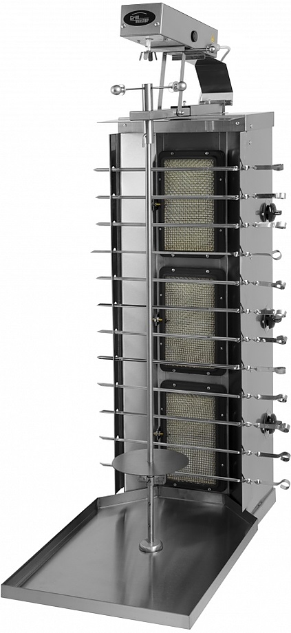 Гриль Grill Master Ф3ШМГ используется на предприятиях общественного питания, торговли и пищевых производствах для приготовления шаурмы из свиного, говяжьего, бараньего и куриного мяса. Модель оснащена газ-контролем и поддоном для мяса. Материал изделия - высококачественная нержавеющая сталь.