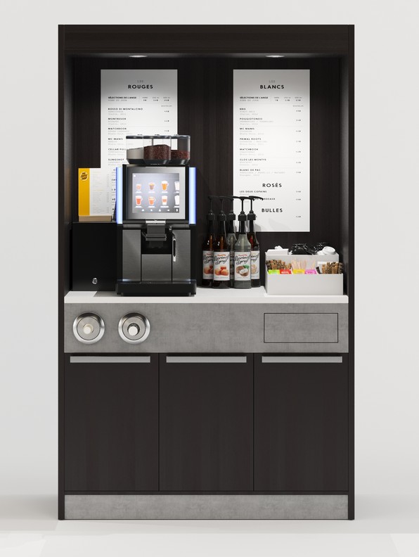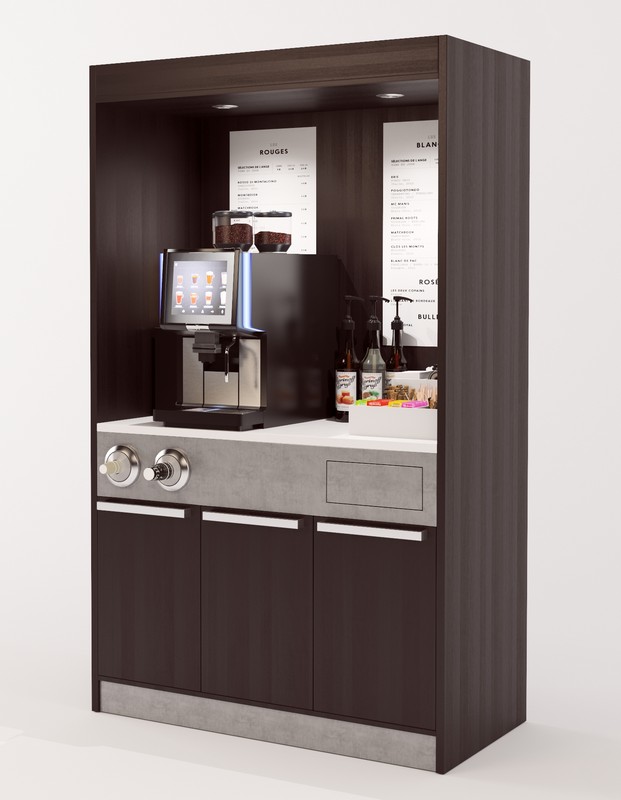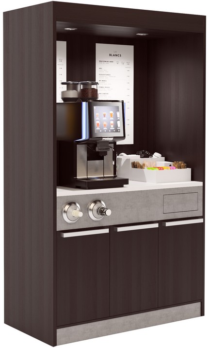 Кофейная станция используется на предприятиях общественного питания, торговли и пищевых производствах для приготовления и раздачи кофейных напитков. Модель оснащена диспансером для стаканов и люком для мусора. Цвет корпуса - Венге складской.