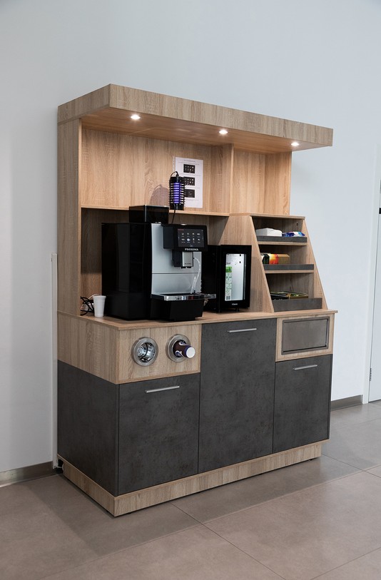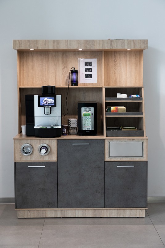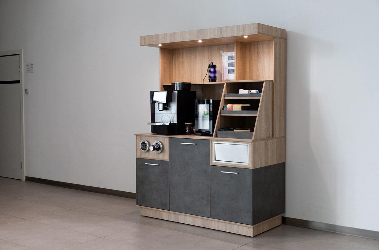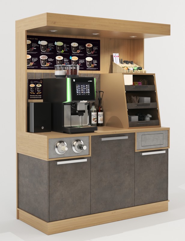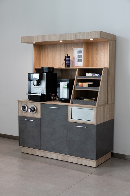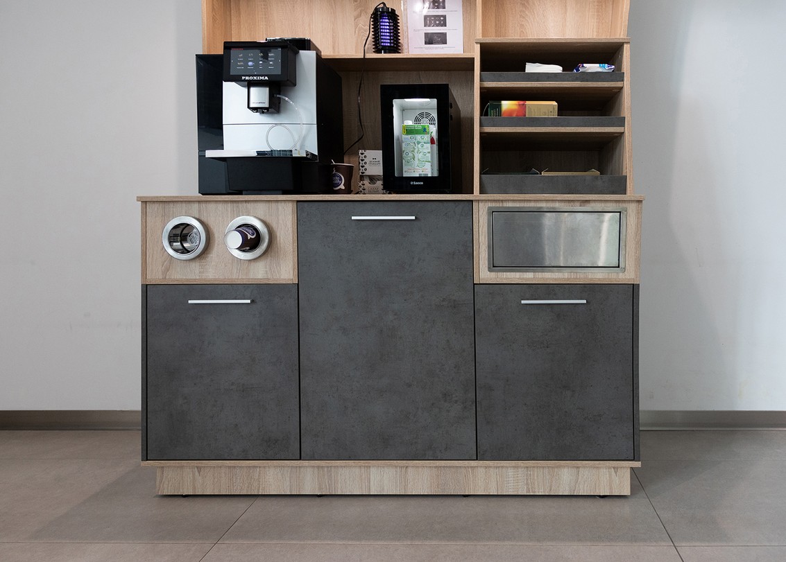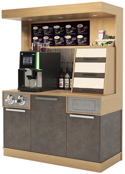 Кофейная станция используется на предприятиях общественного питания, торговли и пищевых производствах для приготовления и раздачи кофейных напитков. Модель оснащена д3 светильниками, диспансером для стаканов, люком для мусора и этажеркой с выдвижными полками. Цвет корпуса - Бетон Чикаго светло-серый, дуб Бардолино натуральный.
