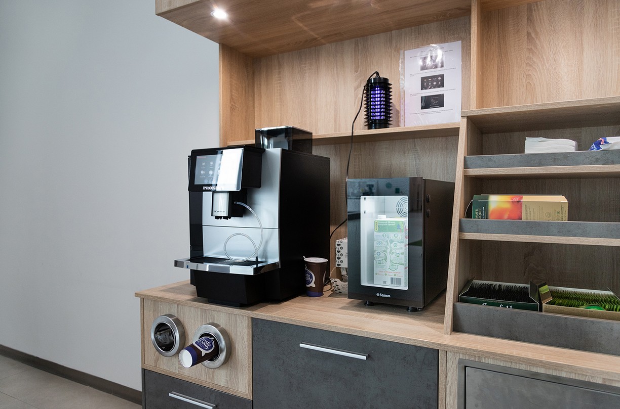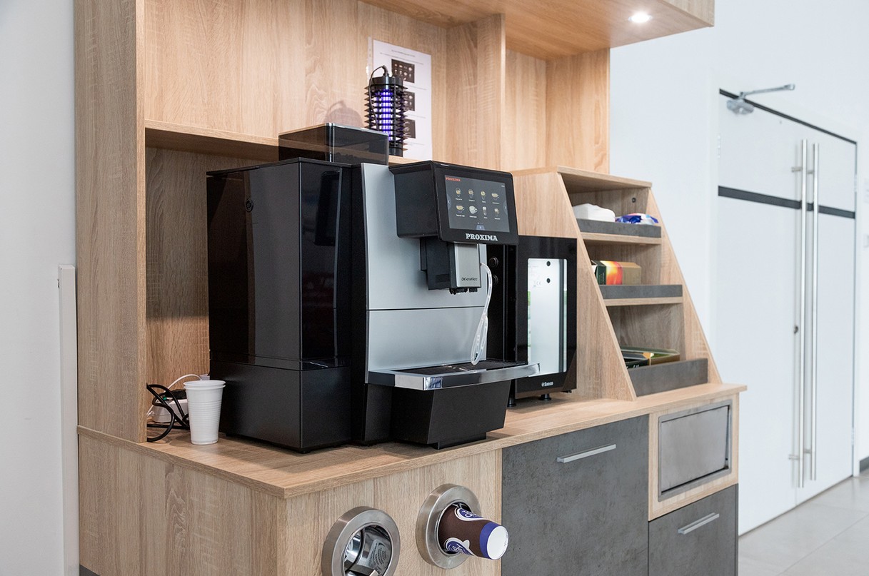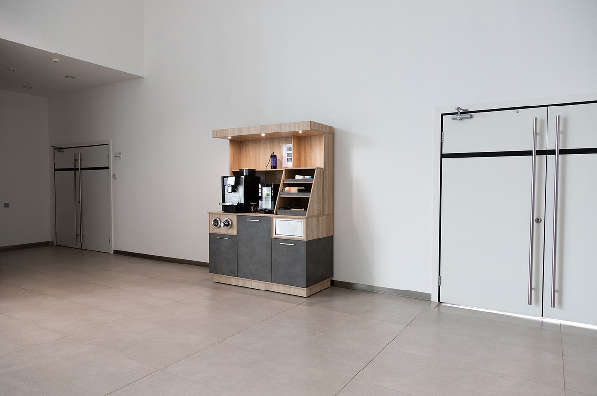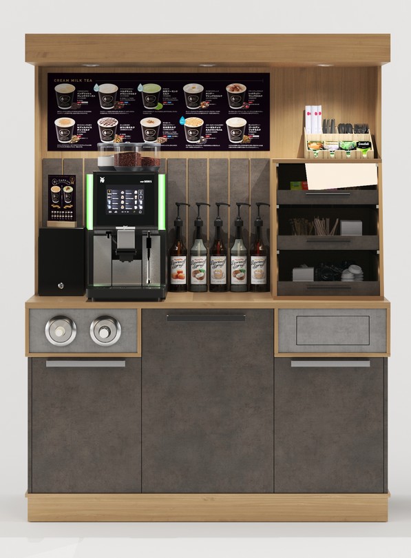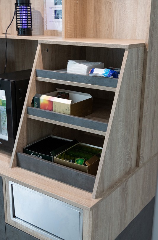 Кофейная станция используется на предприятиях общественного питания, торговли и пищевых производствах для приготовления и раздачи кофейных напитков. Модель оснащена д3 светильниками, диспансером для стаканов, люком для мусора и этажеркой с выдвижными полками. Цвет корпуса - Бетон Чикаго светло-серый, дуб Бардолино натуральный.
