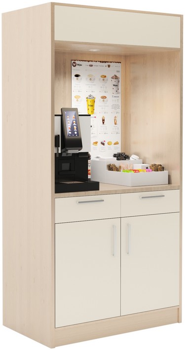 Кофейная станция используется на предприятиях общественного питания, торговли и пищевых производствах для приготовления и раздачи кофейных напитков. Модель оснащена светильником, ящиками и шкафами. Цвет корпуса - Флитвуд шапмань, Коттон бежевый.