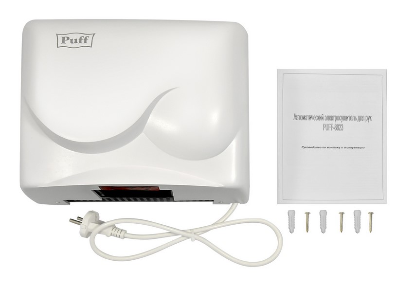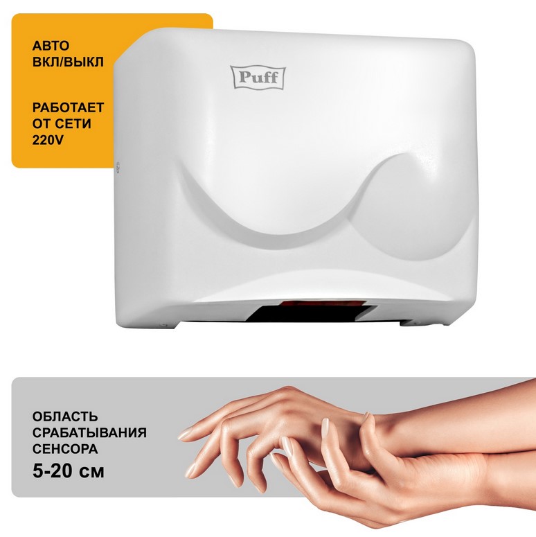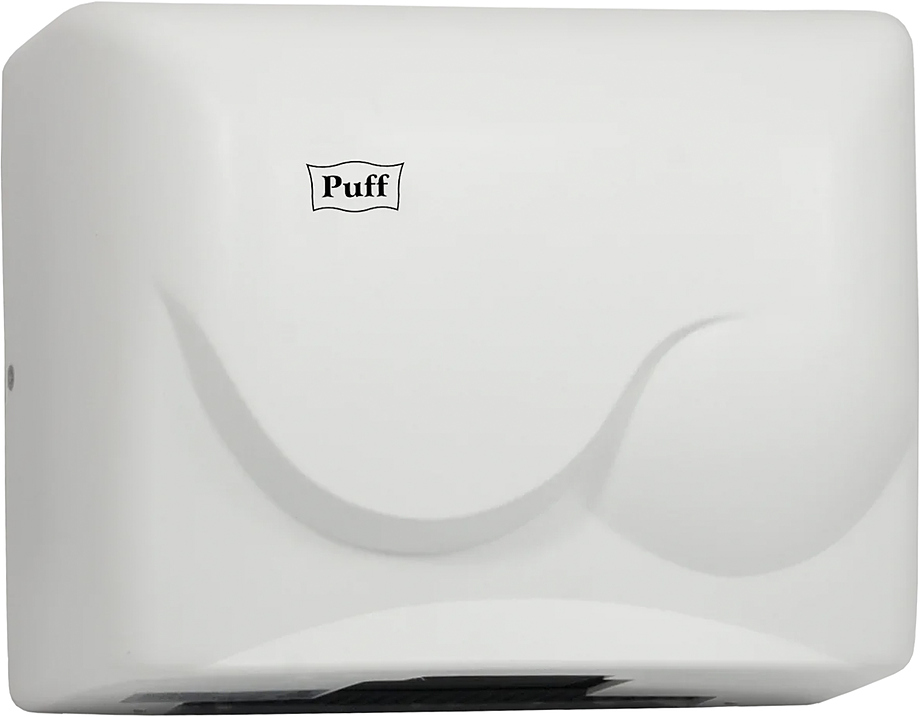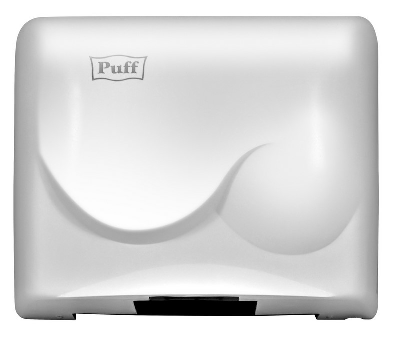 Сушилка PUFF 8823 используется в туалетных комнатах торговых центров, гостиниц, аэропортов, предприятий общепита и других местах массового пребывания для бесконтактной сушки рук. Модель с автоматическим управлением (сенсорным) и 1 режимом скорости и температуры. Материал корпуса - ABS-пластик белого цвета.