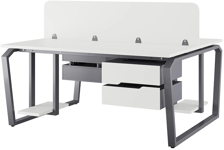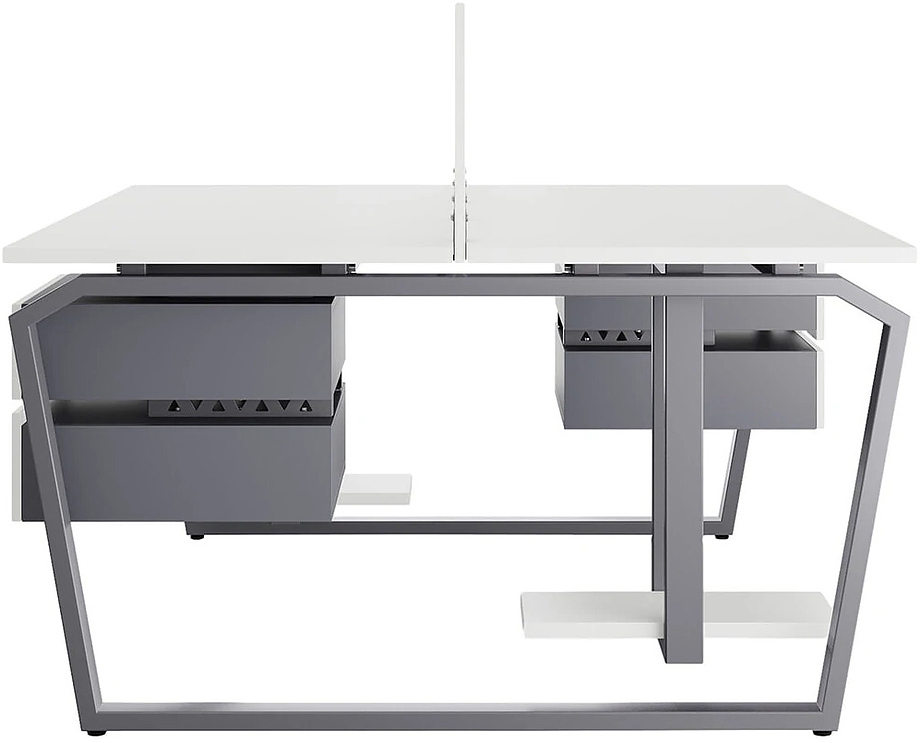 Офисный стол Кобор TB/2-140/140 graphite/premium предназначен для двух рабочих мест и идеально подходит для офисов и кабинетов руководителей. Модель оснащена опорами в виде обратной трапеции с скошенными верхними углами. Материал столешницы - прочный ЛДСП толщиной 25 мм, усиленная снизу металлическим каркасом, материал опор и каркаса - окрашенный металл.