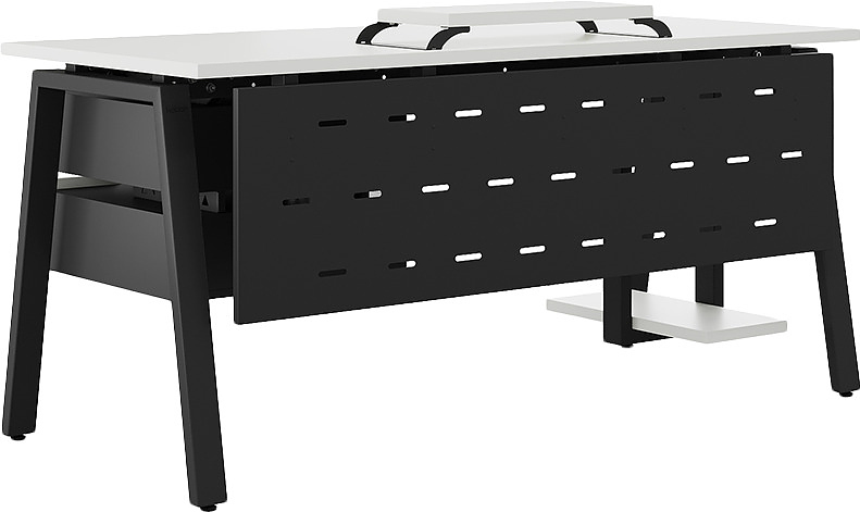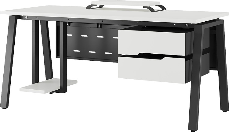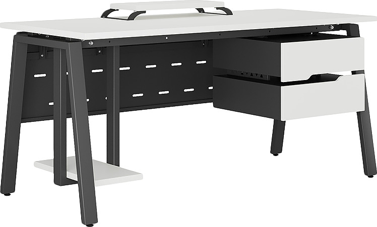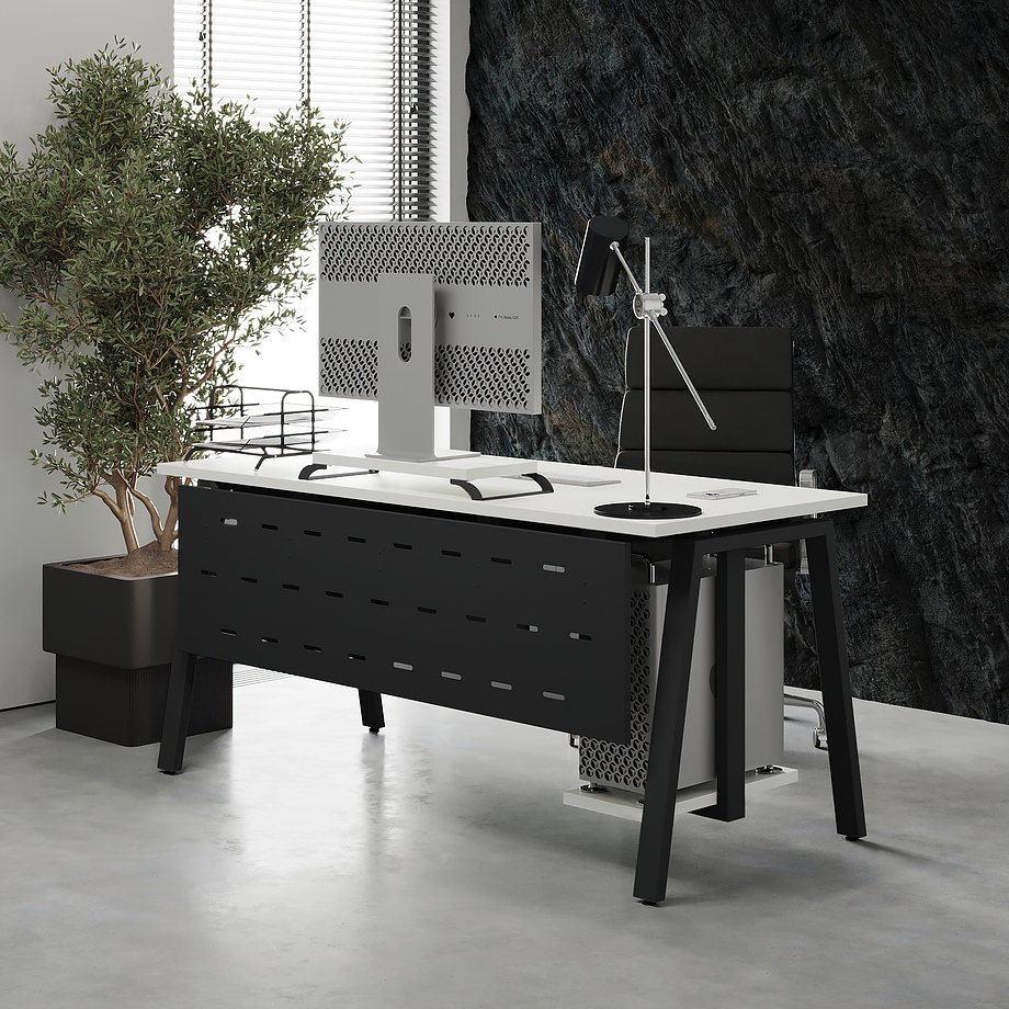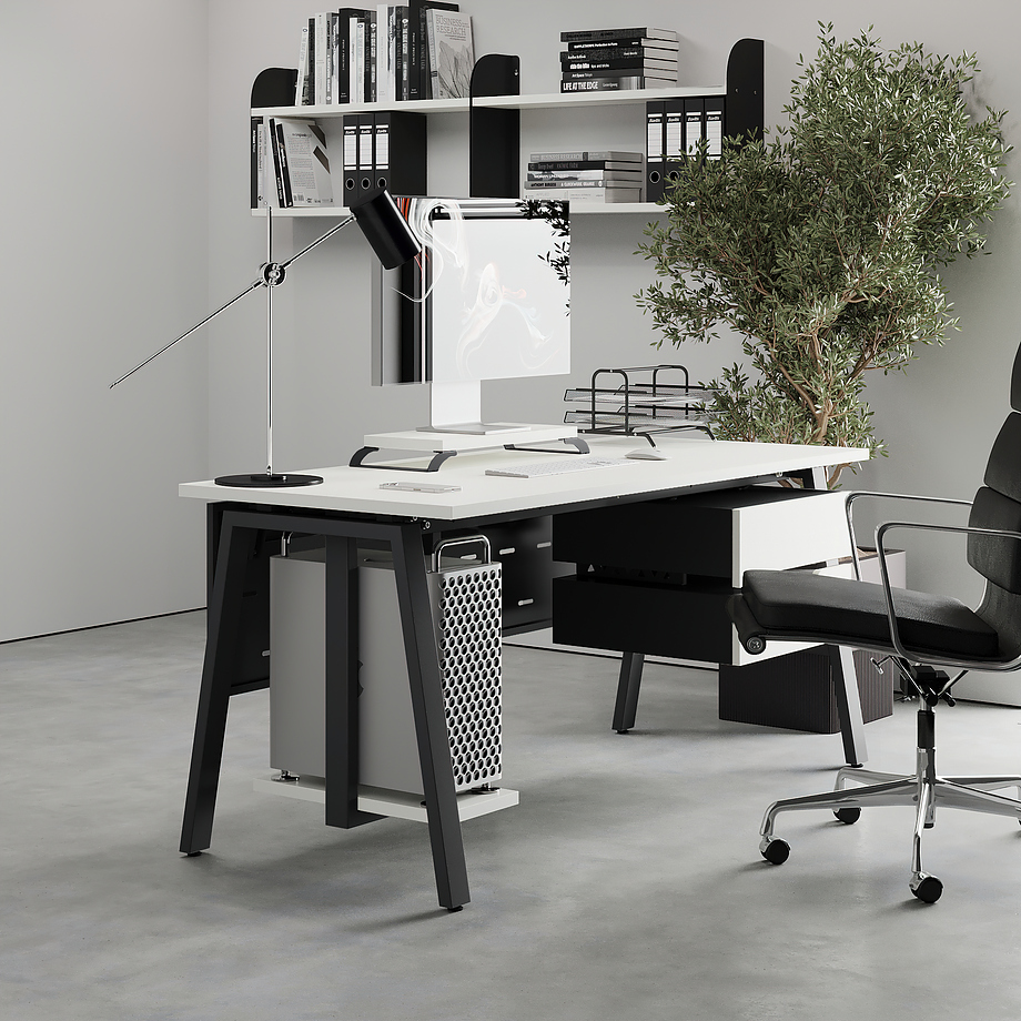 Офисный стол КОБОР A-120/60 black/premium используется в офисных помещениях и кабинетах руководителей. Модель оснащена А-образными опорами. Материал столешницы - прочный ЛДСП толщиной 25 мм, усиленная снизу металлическим каркасом, материал опор и каркаса - окрашенный металл.