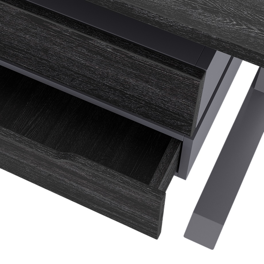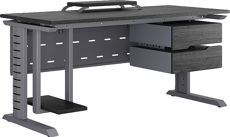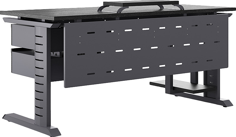 Офисный стол КОБОР L2-120/60 graphite/wood используется в офисных помещениях и кабинетах руководителей. Модель оснащена L-образными опорами с декоративной вставкой на боковинах. Материал столешницы - прочный ЛДСП толщиной 25 мм, усиленная снизу металлическим каркасом, материал опор - окрашенный металл.