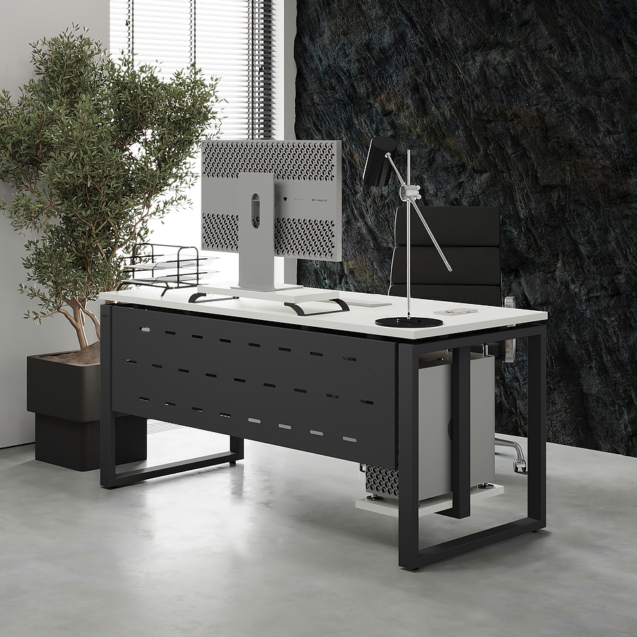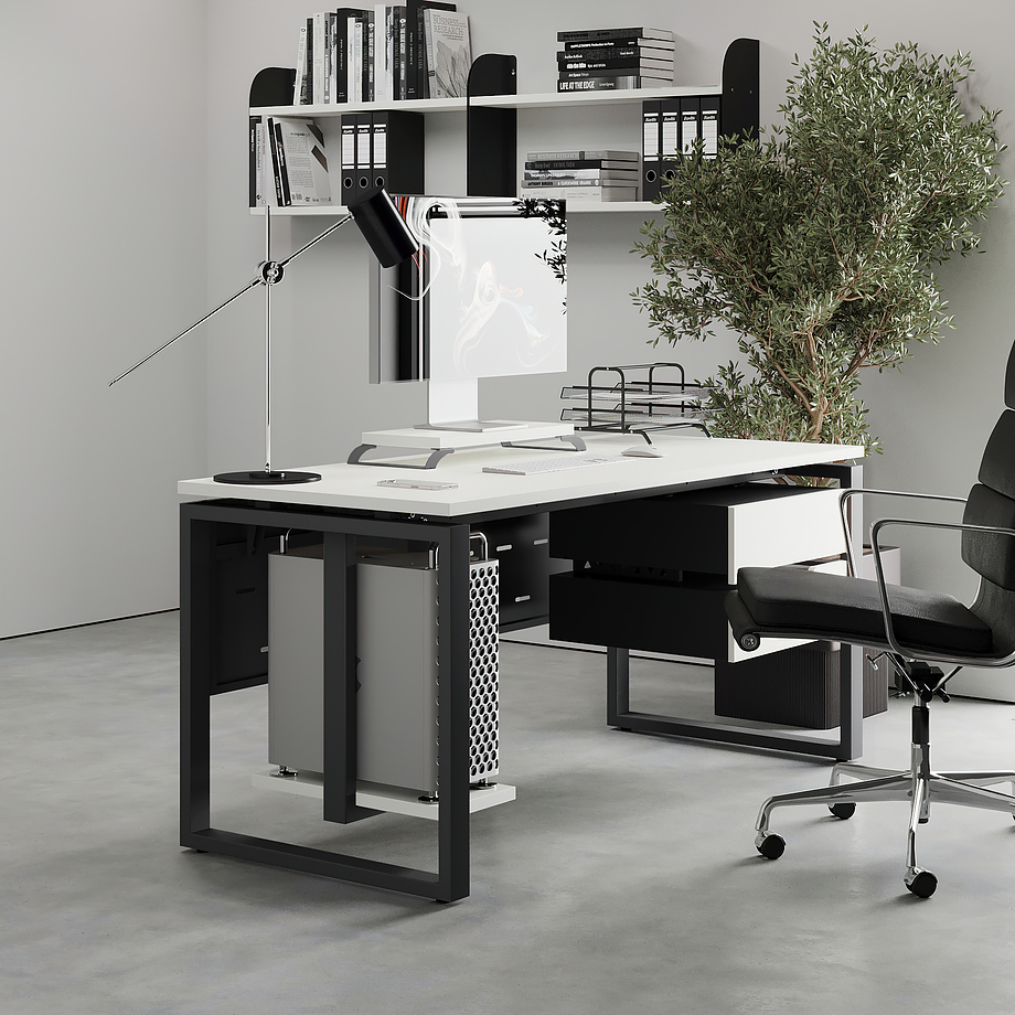 Офисный стол КОБОР O1-140/70 black/premium используется в офисных помещениях и кабинетах руководителей. Модель оснащена О-образными опорами. Материал столешницы - прочный ЛДСП толщиной 25 мм, усиленная снизу металлическим каркасом, материал опор - окрашенный металл.